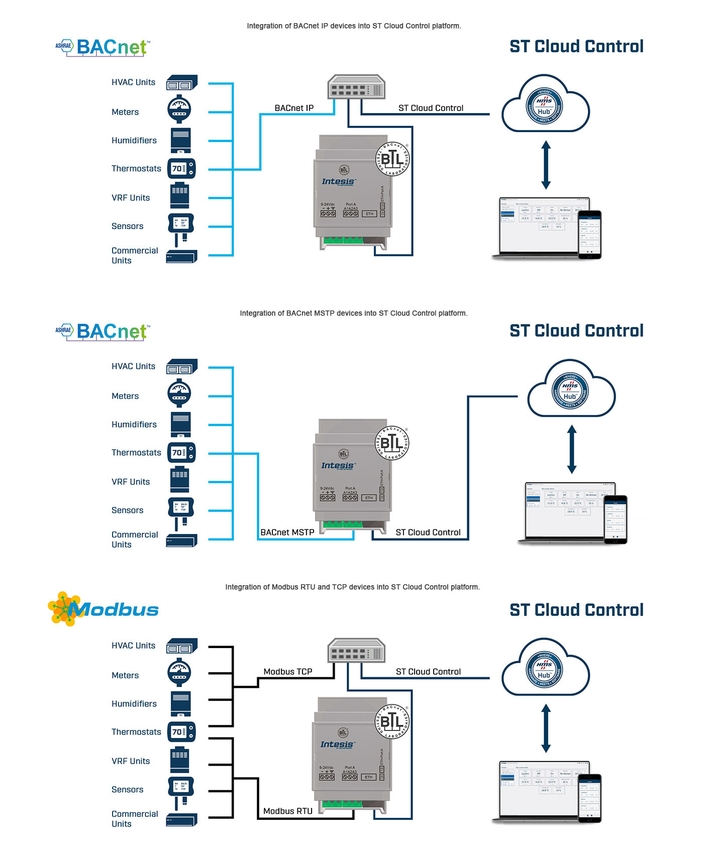 This gateway provides cloud connectivity to Modbus or BACnet devices so they can be monitored and controlled using the ST Cloud Control interfaces.