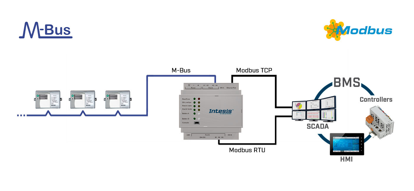 Integrate any M-Bus device with a Modbus BMS or any Modbus TCP or Modbus RTU controller. The aim of this integration is to make accessible M-Bus devices, its registers and resources from a Modbus based control system or device, as if it was a part of the own Modbus system and vice-versa.