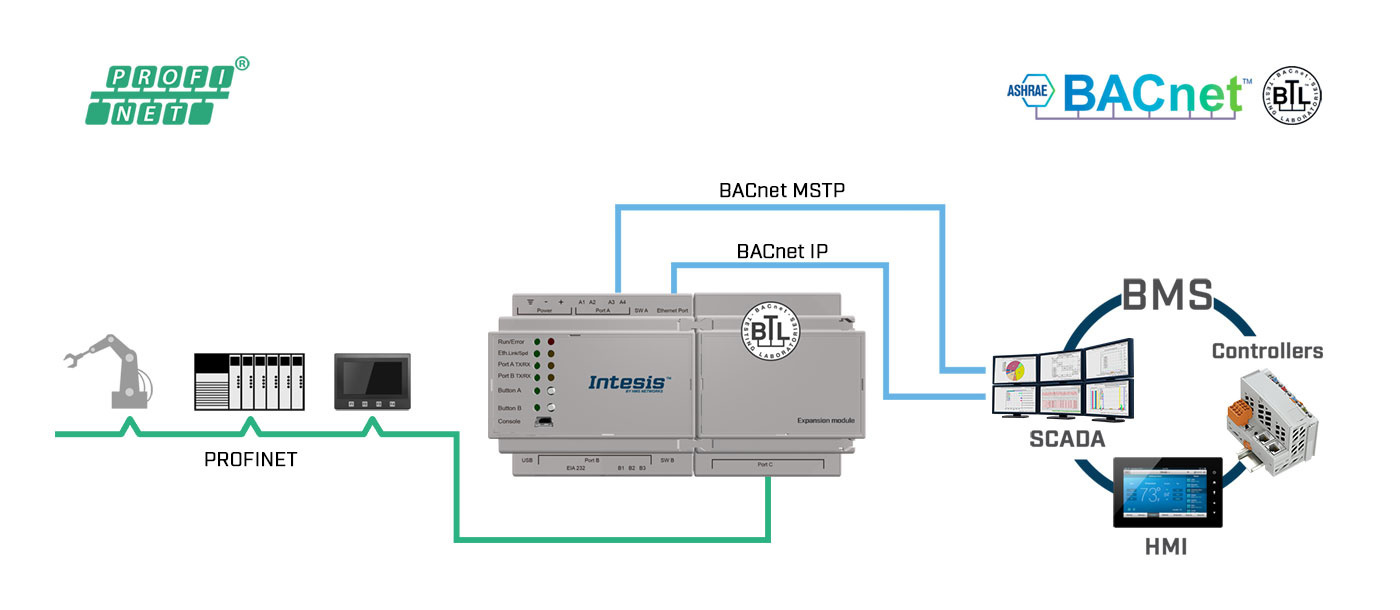 The Intesis BACnet-PROFINET gateway allows you to seamlessly inter-connect PLC/BMS systems and their connected devices between BACnet IP&MSTP Control systems and PROFINET networks.