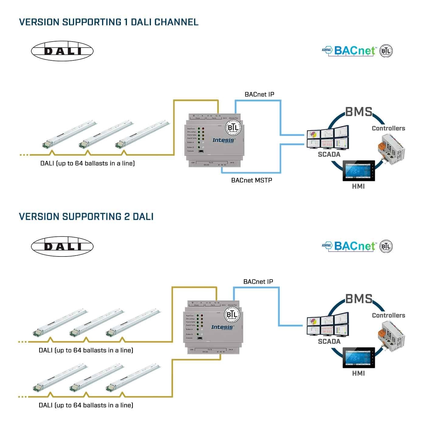 Integreer elke DALI of DALI-2 driver, lichtsensor of aanwezigheidssensor met een BACnet BMS of een BACnet IP- of BACnet MS/TP-controller. Het doel van deze integratie is om DALI apparaten en haar gegevens en bronnen toegankelijk te maken vanaf een op BACnet gebaseerd besturingssysteem of apparaat, alsof het een onderdeel is van het eigen BACnet-systeem en omgekeerd.